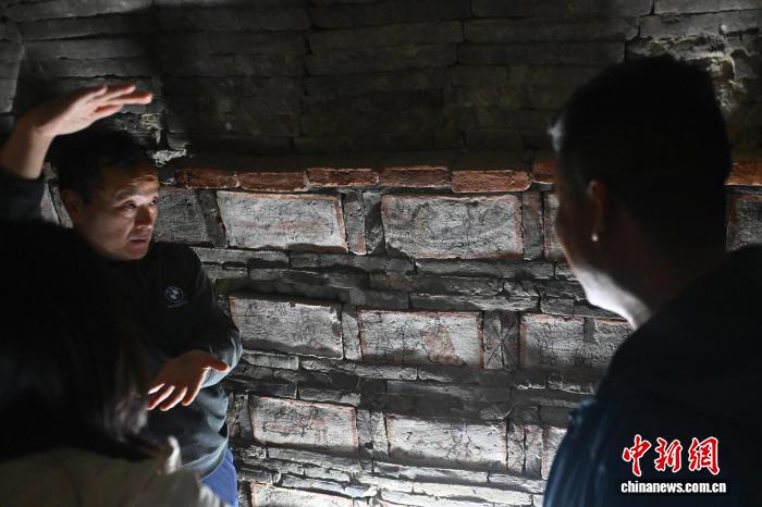 9月24日,正在位于苦肃省嘉峪闭市的嘉峪闭新乡魏晋墓群6号墓内乱,任务职员背搭客批注绘像砖里的小说。中新社记者 李亚龙 摄