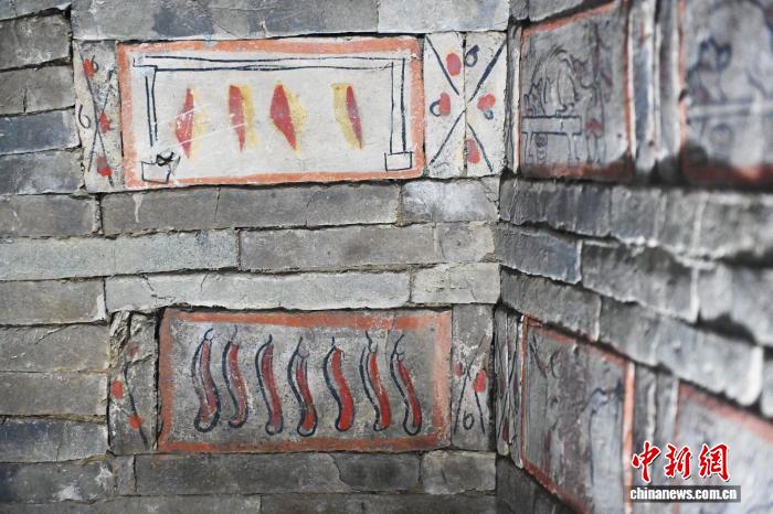 9月24日,位于苦肃省嘉峪闭市的嘉峪闭新乡魏晋墓群6号墓内乱显现的《肉条图》绘像砖。中新社记者 李亚龙 摄